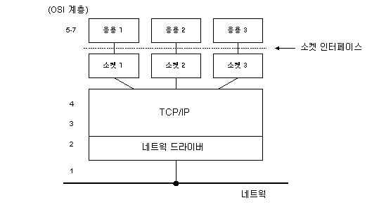 출처: http://jkkang.net/unix/netprg/chap2/net2_1.html 소켓은 운영체제가 제공하는 인터페이스로 애플리케이션 계층의 프로그램이 네트워크 서비스를 사용할 수 있게하는 역할을 한다. TCP/IP 4계층으로 이야기하면 Application 계층과 Transport 계층 사이에 존재하게 된다. 이렇기 때문에 소켓은 애플리케이션이 Transport 계층의 세부 사항을 신경쓰지 않고 네트워크 통신을 할 수 있도록 인터페이스를 제공한다. (transport 계층 역할 예시: checksum, TCP라면 segmentation, ...)