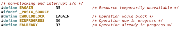 https://opensource.apple.com/source/xnu/xnu-201/bsd/sys/errno.h.auto.html 35번 에러코드는 EAGAIN이고, 논블로킹 에러임을 확인할 수 있다.