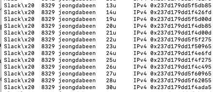 터미널에 sudo fs_usage를 입력하면 [ 35]라는게 있을텐데 이게 에러 코드이다. Slack을 실행하면 자주 볼 수 있다
