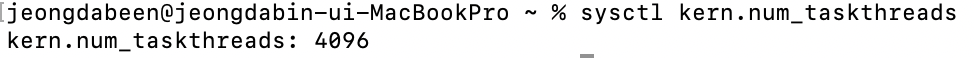 여담으로 소켓은 무한정으로 만들어낼 수 있는데, 스레드는 과연 몇 개를 만들 수 있는지 궁금해졌다. 찾아보니 이론적으로는 메모리가 버틸 수 있을만큼 만들어낼 수 있다. 하지만 터미널에 sysctl kern.num_taskthreads를 입력해보면 프로세스 하나당 만들 수 있는 스레드 개수가 제한되어 있다. 그래서 스프링 프로젝트에 스레드를 생성해보면 4096개 이하로 생성할 수 있음을 알 수 있다. 근데 이것도 루트 계정으로 값을 변경할 수 있다.