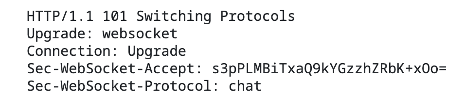 - Sec-WebSocket-Accept : Sec-WebSocket-Key를 기반으로 업그레이드 패킷을 정상적으로 수신했음을 알린다.