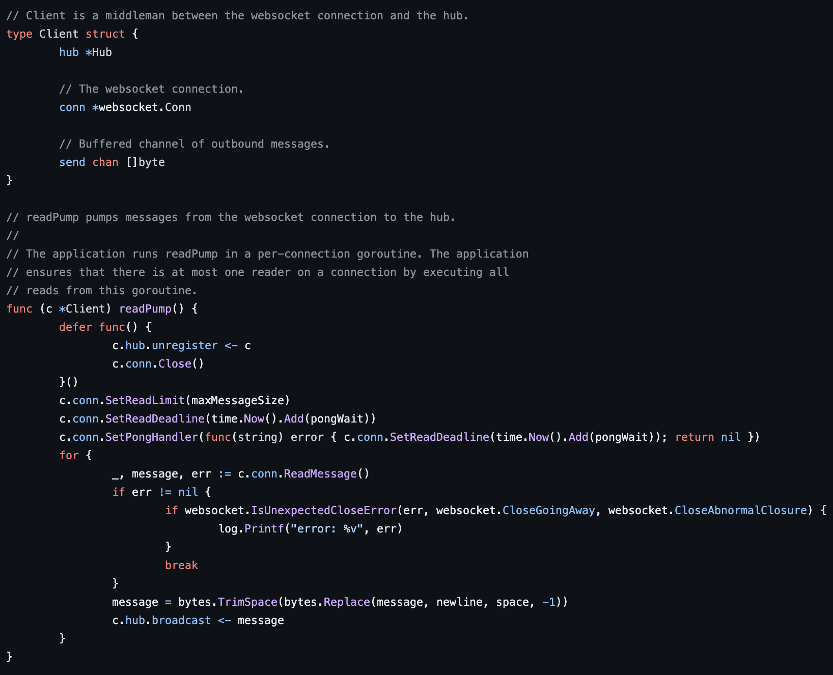 https://github.com/gorilla/websocket/blob/main/examples/chat/client.go#L41 웹소켓으로 데이터가 오면 읽는 작업이 펼쳐진다. 중요한 부분은 readPump 함수의 for문 안에 c.conn.ReadMessage()이다. c.conn은 Client의 websocket.conn이므로 이게 무엇으로 이루어져 있는지 찾아보자