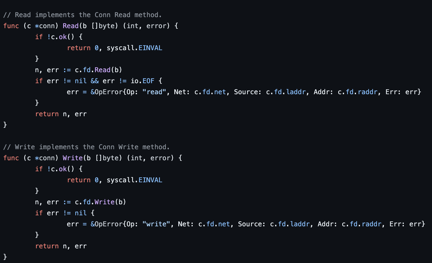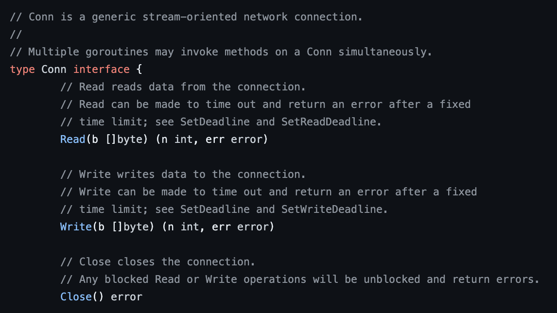 https://github.com/golang/go/blob/master/src/net/net.go#L119 찾아보니 Conn은 인터페이스이다. Conn 구현체 코드는 바로 아래 있었다.
