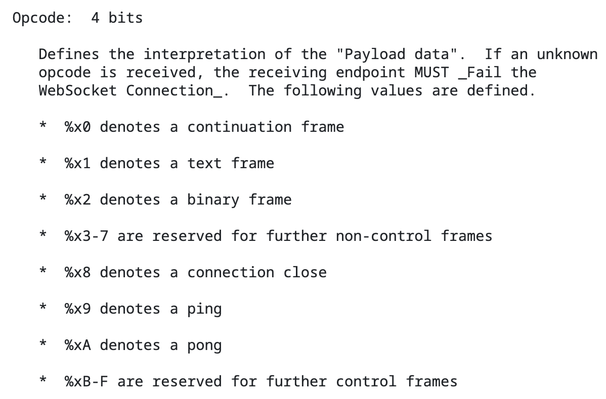 https://datatracker.ietf.org/doc/html/rfc6455#section-5.2 opcode 값에 따라 Payload Data가 달라지게 된다.