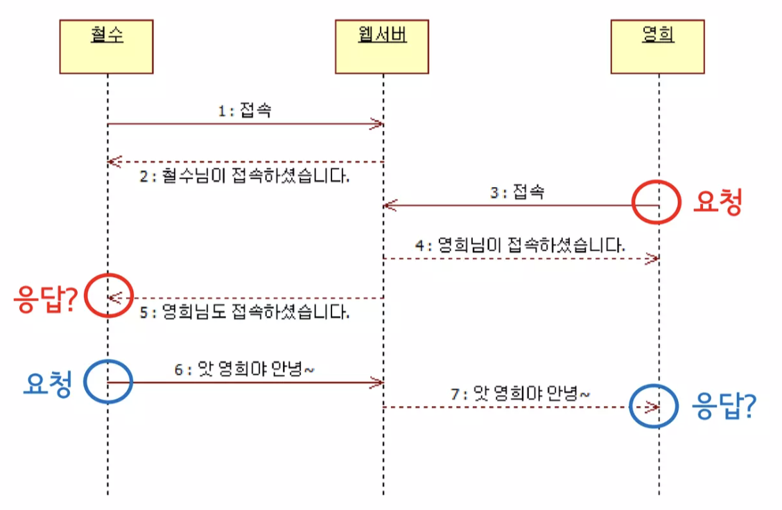 https://www.slideshare.net/slideshow/111015-html5-1/9726213 위 사진을 보면 철수와 영희가 채팅방에 들어왔는데, 서버에서 "영희님도 접속했습니다."라는 문구를 철수에게 알려줘야 하는 상황이 발생한다. 이후 철수가 채팅방에 "앗 영희야 안녕~"을 보내면 서버는 영희에게 "앗 영희야 안녕~"을 보내줘야하는데, HTTP 대전제와 맞지 않게 응답에 필요한 요청이 없는 상황이다. 사용자의 입장에서는 이렇게 보이지만, 기술적으로는 크게 두 가지 방법으로 문제를 해결했었다.