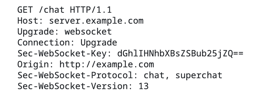 https://datatracker.ietf.org/doc/html/rfc6455#section-1.2 먼저 클라이언트가 서버에게 웹소켓으로 업그레이드를 요청한다.