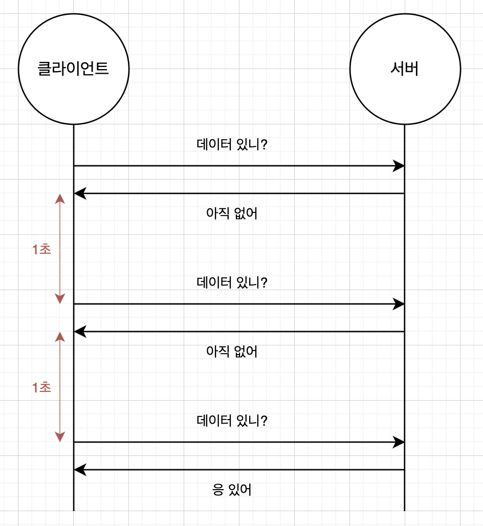 첫번째 방법은 클라이언트가 주기적으로 요청을 보내는 방식이다. "영희님도 접속했습니다"로 응답을 보내기 전에 철수 클라이언트에서 먼저 서버에게 데이터가 들어왔는지 요청을 하게 된다. 이로 인한 문제점은 너무 쓸모 없는 요청이 많아지게 되고, 서버의 부담이 커지게 된다는 점이다. 이것보다 발전된게 HTTP Long Polling이다. 서버에서 바로 응답을 하지 않고 연결을 계속 유지하고 있다가 전달할 내용이 있어야 응답을 보내는 방식이다. Polling 방식보다는 많은 요청을 받지 않아도 되지만, 이번엔 커넥션을 계속 열어둬야 한다는 문제점이 존재한다. 참고로 당근마켓의 채팅서버가 원래 Polling 방식으로 되어 있다가 웹소켓으로 바꿨다.