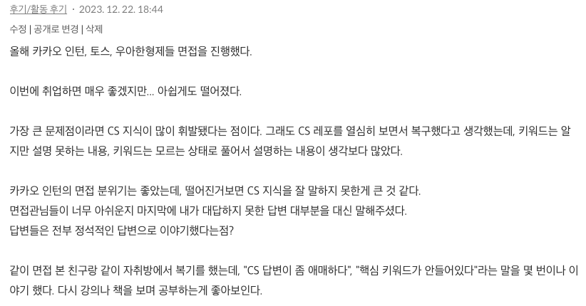 위 사진은 23년 12월 22일에 카카오 인턴 면접 떨어진 당일에 저만 보도록 비공개로 적었던 내용입니다. 이후에 책을 추천 받아 다시 처음으로 돌아가보자는 마음으로 책부터 다시 읽고, 새롭게 지식을 쌓아서 계속 공부해왔어요. 저도 이미 알고있는 내용들이 있으니까 옆으로 계속 덧붙여서 지식을 쌓는게 중요하다고 생각했는데, 이때 이후로 새롭게 지식을 쌓다보니 놓친 내용들이 많다는 점을 정말 많이 알게 됐습니다. 올해 쓰는 블로그 글들은 최대한 자세히 적으려고 노력하는데요. 저때 느꼈던게 빨리 취업하고 싶으니까 쉬운 길로만 급급하게 찾아가려고 했던게 아닐까라는 생각이 들었습니다. 포스팅 글을 보신 분들은 알겠지만, 자세히 공부해도 그 기술에 한정되어 공부하는게 아니라, 다양한 지식들을 학습하게 됩니다. 그래서 지금은 이렇게 공부하는게 정말 배울점이 많다고 생각합니다.